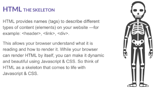 Let’s imagine a website as a person. We’ll use this analogy to understand our website. The HTML is best described as the skeleton: